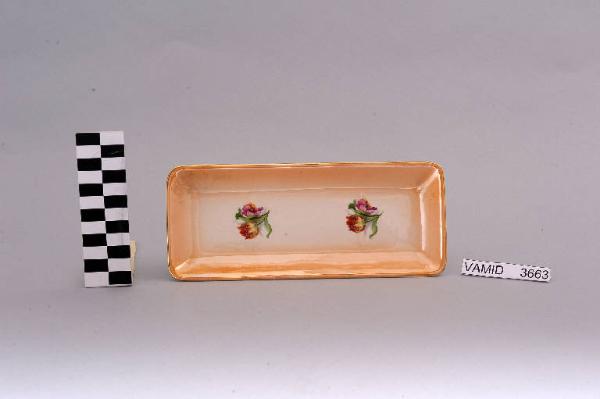 Portasapone rettangolare con angoli smussati; fondo smaltato color rosa salmone sfumato decorato con due piccoli bouquets floreali policromi.