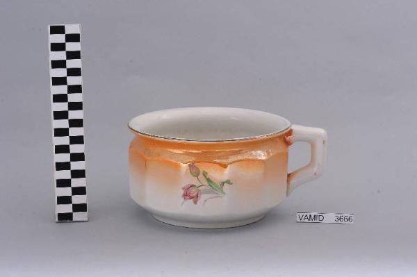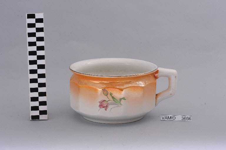 - NOTIZIE STORICO CRITICHE Si tratta probabilmente di una tipologia copiata dalla manifattura di Sarreguemines. La decorazione floreale, resa con morbidi effetti di chiaroscuro e con una policromia ricca e sfumata realizzata con la tecnica della decalcomania soprasmalto, richiama quei decori naturalistici in voga all'inizio del secolo poi ripresi tra gli anni Settanta e Ottanta. L'oggetto, appartenente ad un servizio igienico da camera (num. inv. 3663-3666), fa parte di una donazione di privati al Museo (Fantoni Marilena, 2009). Nel Midec è conservato un servizio igienico da camera tipologicamente simile ma con motivi ornamentali diversi (fondo smaltato di rosso e rosa sfumati con decori giapponesi) prodotto sempre dalla "S.C.I." e databile al primo quarto del Novecento (num. inv. 2137-2139).