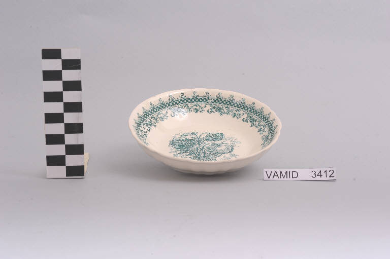 • NOTIZIE STORICO CRITICHE La linea ancora classica e morbidamente ondulata dell'oggetto in esame e un decoro minuto e lezioso, fortemente naturalistico e tridimensionale caratterizzato da sfumature ed effetti di luce, richiamano un gusto in voga tra la fine dell'Ottocento e l'inizio del Nocevento. L'ornato costituito da elementi floreali e da una maglia romboidale è realizzato con la tecnica della decalcomania sottosmalto in monocromo color verde. La coppetta, appartenente ad un servizio da frutta composto da quattordici elementi (num. inv. 3406-3419), fa parte di una donazione di privati al Museo. Nel Midec sono conservati un servizio da caffè con la medesima greca ornamentale in monocromo color blu (num. inv. 3346-3375) e una matrice di incisione recante sul recto quattro composizioni tipologicamente vicine al decoro floreale al centro (num. inv. 2515).