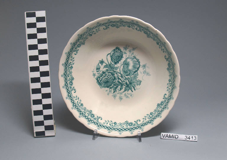 - NOTIZIE STORICO CRITICHE La linea ancora classica e morbidamente ondulata dell'oggetto in esame e un decoro minuto e lezioso, fortemente naturalistico e tridimensionale caratterizzato da sfumature ed effetti di luce, richiamano un gusto in voga tra la fine dell'Ottocento e l'inizio del Nocevento. L'ornato costituito da elementi floreali e da una maglia romboidale è realizzato con la tecnica della decalcomania sottosmalto in monocromo color verde. La fruttiera, appartenente ad un servizio da frutta composto da quattordici elementi (num. inv. 3406-3419), fa parte di una donazione di privati al Museo. Nel Midec sono conservati un servizio da caffè con la medesima greca ornamentale in monocromo color blu (num. inv. 3346-3375) e una matrice di incisione recante sul recto quattro composizioni tipologicamente vicine al decoro floreale al centro (num. inv. 2515).