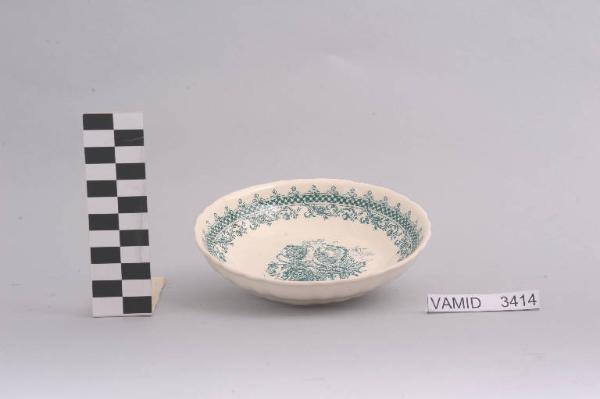 - NOTIZIE STORICO CRITICHE La linea ancora classica e morbidamente ondulata dell'oggetto in esame e un decoro minuto e lezioso, fortemente naturalistico e tridimensionale caratterizzato da sfumature ed effetti di luce, richiamano un gusto in voga tra la fine dell'Ottocento e l'inizio del Nocevento. L'ornato costituito da elementi floreali e da una maglia romboidale è realizzato con la tecnica della decalcomania sottosmalto in monocromo color verde. La coppetta, appartenente ad un servizio da frutta composto da quattordici elementi (num. inv. 3406-3419), fa parte di una donazione di privati al Museo. Nel Midec sono conservati un servizio da caffè con la medesima greca ornamentale in monocromo color blu (num. inv. 3346-3375) e una matrice di incisione recante sul recto quattro composizioni tipologicamente vicine al decoro floreale al centro (num. inv. 2515).