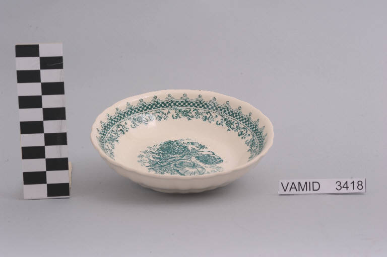 - NOTIZIE STORICO CRITICHE La linea ancora classica e morbidamente ondulata dell'oggetto in esame e un decoro minuto e lezioso, fortemente naturalistico e tridimensionale caratterizzato da sfumature ed effetti di luce, richiamano un gusto in voga tra la fine dell'Ottocento e l'inizio del Nocevento. L'ornato costituito da elementi floreali e da una maglia romboidale è realizzato con la tecnica della decalcomania sottosmalto in monocromo color verde. La coppetta, appartenente ad un servizio da frutta composto da quattordici elementi (num. inv. 3406-3419), fa parte di una donazione di privati al Museo. Nel Midec sono conservati un servizio da caffè con la medesima greca ornamentale in monocromo color blu (num. inv. 3346-3375) e una matrice di incisione recante sul recto quattro composizioni tipologicamente vicine al decoro floreale al centro (num. inv. 2515).