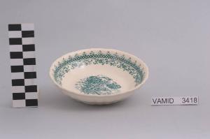 Coppetta con orlo ondulato; fondo bianco avorio decorato all'interno da motivo floreale e lungo il bordo da maglia romboidale ornata da piccoli fiori in monocromo color verde.