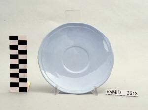 - NOTIZIE STORICO CRITICHE Il piattino in esame, appartenente ad un servizio da thè (num. inv. 3613...3627), rientra in una tipologia di vasellame di gusto corrente. Il design sobrio ed elegante e la linea ondulata del bordo indicano una datazione alla prima metà del Novecento. La mancanza di caratteri stilistici particolari impedisce una definizione cronologica più circoscritta. L'oggetto fa parte di una donazione di privati al Museo. Nel Midec sono conservati un piattino (num. inv. 1493) e un servizio da thè (num. inv. 3746-3770) nella variante color bianco con bordi rifiniti da leggere profilature oro e un servizio da thè (num. inv. 3615...3626) color azzurro uniforme i cui piattini presentano una foggia identica a quello in esame.