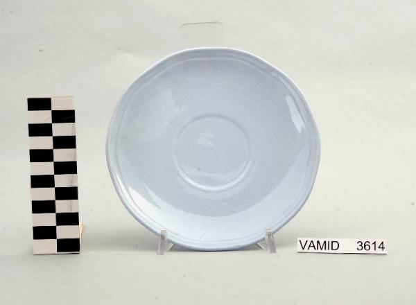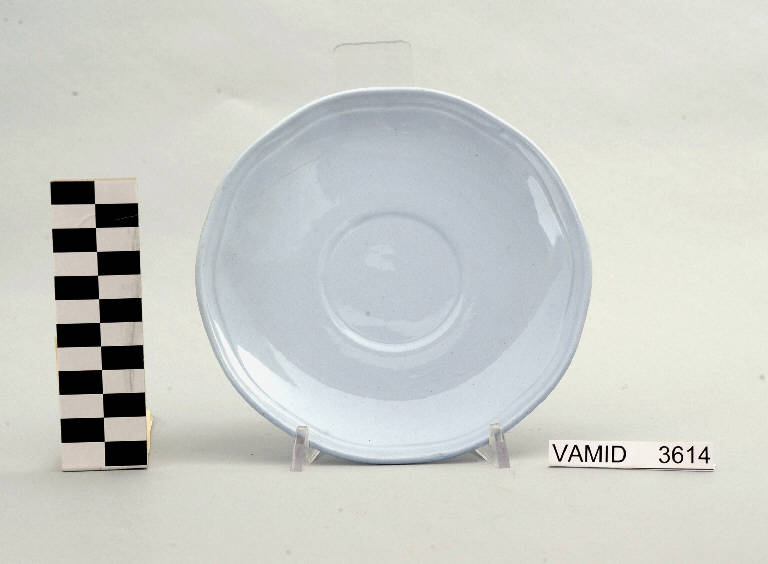 - NOTIZIE STORICO CRITICHE Il piattino in esame, appartenente ad un servizio da thè (num. inv. 3613...3627), rientra in una tipologia di vasellame di gusto corrente. Il design sobrio ed elegante e la linea ondulata del bordo indicano una datazione alla prima metà del Novecento. La mancanza di caratteri stilistici particolari impedisce una definizione cronologica più circoscritta. L'oggetto fa parte di una donazione di privati al Museo. Nel Midec sono conservati un piattino (num. inv. 1493) e un servizio da thè (num. inv. 3746-3770) nella variante color bianco con bordi rifiniti da leggere profilature oro e un servizio da thè (num. inv. 3615...3626) color azzurro uniforme i cui piattini presentano una foggia identica a quello in esame.