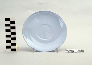 - NOTIZIE STORICO CRITICHE Il piattino in esame, appartenente ad un servizio da thè (num. inv. 3613...3627), rientra in una tipologia di vasellame di gusto corrente. Il design sobrio ed elegante e la linea ondulata del bordo indicano una datazione alla prima metà del Novecento. La mancanza di caratteri stilistici particolari impedisce una definizione cronologica più circoscritta. L'oggetto fa parte di una donazione di privati al Museo. Nel Midec sono conservati un piattino (num. inv. 1493) e un servizio da thè (num. inv. 3746-3770) nella variante color bianco con bordi rifiniti da leggere profilature oro e un servizio da thè (num. inv. 3615...3626) color azzurro uniforme i cui piattini presentano una foggia identica a quello in esame.