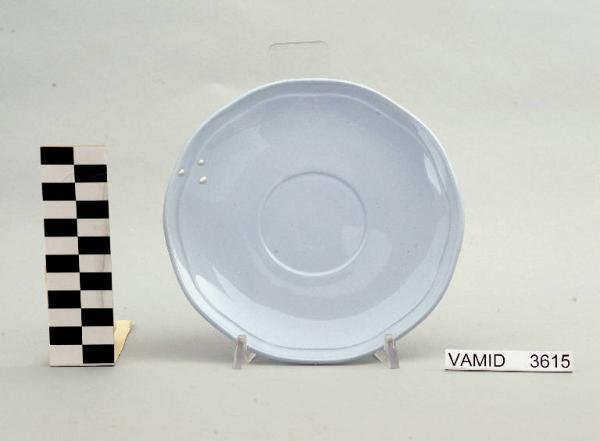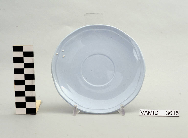 - NOTIZIE STORICO CRITICHE Il piattino in esame, appartenente ad un servizio da thè (num. inv. 3613...3627), rientra in una tipologia di vasellame di gusto corrente. Il design sobrio ed elegante e la linea ondulata del bordo indicano una datazione alla prima metà del Novecento. La mancanza di caratteri stilistici particolari impedisce una definizione cronologica più circoscritta. L'oggetto fa parte di una donazione di privati al Museo. Nel Midec sono conservati un piattino (num. inv. 1493) e un servizio da thè (num. inv. 3746-3770) nella variante color bianco con bordi rifiniti da leggere profilature oro e un servizio da thè (num. inv. 3615...3626) color azzurro uniforme i cui piattini presentano una foggia identica a quello in esame.