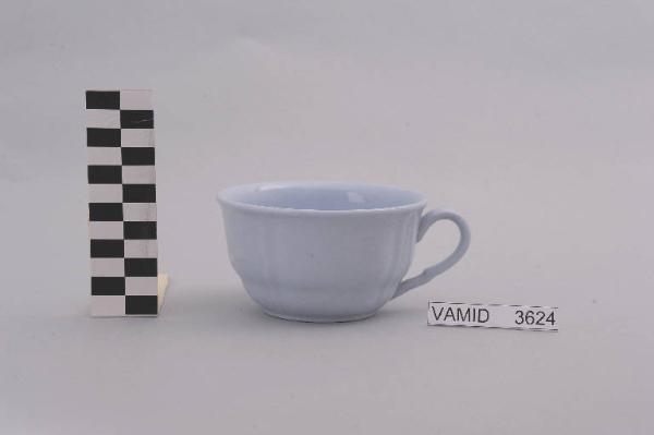 - NOTIZIE STORICO CRITICHE La tazza in esame, appartenente ad un servizio da thè (num. inv. 3613...3627), rientra in una tipologia di vasellame di gusto corrente. Il design sobrio ed elegante e il motivo a costole verticali leggermente a rilievo indicano una datazione alla prima metà del Novecento. La mancanza di caratteri stilistici particolari impedisce una definizione cronologica più circoscritta. La foggia dell'oggetto, facente parte di una donazione di privati al Museo, ricorda vagamente le forme dei servizi "Pescara" e "Vecchio Milano".