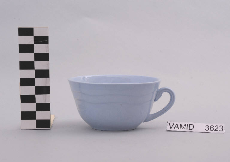 Tazza da thè di color azzurro uniforme con corpo leggermente svasato; restringimento in prossimità del piede circolare; motivo ondulato a rilievo all'esterno; manico a "C".