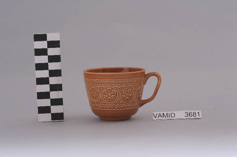 Tazza da thè con alto bordo esterno decorato con motivi decorativi geometrici e vegetali a rilievo; fondo color giallo aranciato.