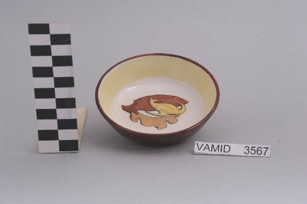 Ciotola di forma circolare rifinita con alto bordo color giallo pastello; fondo bianco decorato al centro con una figurazione policroma; bordo rifinito con filettatura marrone; marrone esternamente