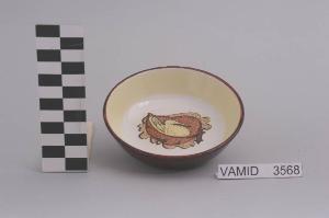Ciotola di forma circolare rifinita con alto bordo color giallo pastello; fondo bianco decorato al centro con una figurazione policroma; bordo rifinito con filettatura marrone; marrone esternamente