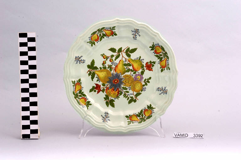 Piatto piano con bordo ondulato; fondo bianco con motivo decorativo vegetale policromo disposto regolarmente lungo il bordo e al centro del cavetto