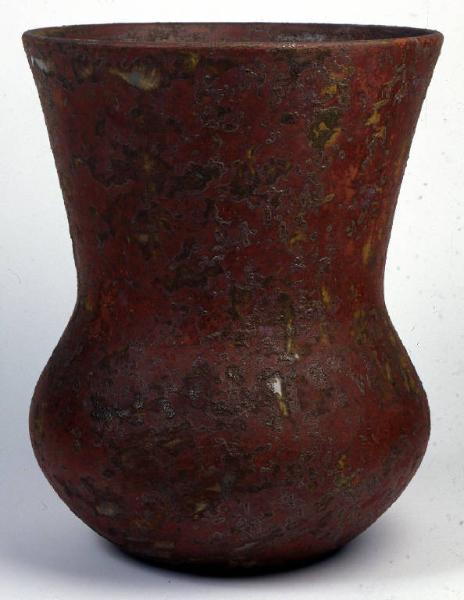 Vaso lavorato al tornio con corpo basso e rigonfio, e con largo collo troncoconico. Il corpo in terraglia bianca è interamente rivestito da una vernice citrina; la parete esterna è decorata con uno smalto mat monocromo rosso ferroso, su cui sono presenti alcune iridescenze ottenute con colature di uno smalto bruno-verdastro.