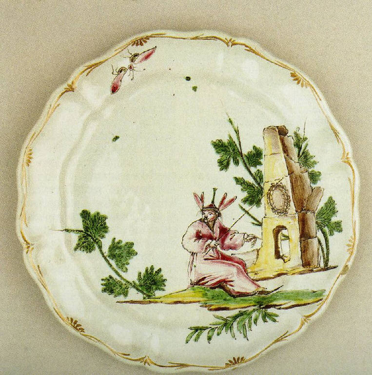 Il piatto esalobato ha un orlo profilato in oro con virgole rocaille che ne movimentano la superficie. Al centro del piatto è raffigurata una scena di gusto orientaleggiante con figura di giovane cinese seduto a terra di tre quarti, mentre indica con la mano sinistra un edificio piramidale, quasi una rovina, alle sue spalle. La scena è arricchita da elementi vegetali e naturali. Il giovane indossa un lungo kimono e un particolare copricapo composto da una serie di punte verso l'alto.\nL'intera scena è dipinta con colori a piccolo fuoco con toni viola e rosa.