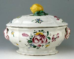 Zuppiera foggiata a stampo con presentatoio. La zuppiera ha una forma elaborata, un alto piede svasato ne slancia il corpo che è accentuato dalla parete costolata. Ai fianchi due prese laterali a rocaille. Completa la zuppiera il coperchio a calotta, leggermente aggettante e dall'orlo estroflesso, che è caratterizzato da una presa a forma di limone, con una chiara volontà trompe-l'oeil. \nIl piatto presenta un orlo octolobato sottolineato da una cordonatura, costolature lungo la tesa e balza mossa. \nLa decorazione della zuppiera e del presentatoio è costituita da elementi floreali; in particolare sul corpo della zuppiera è presente una grande rosa dipinta con brevi e rapide pennellate, accompagnata da fiori minori e foglie.
