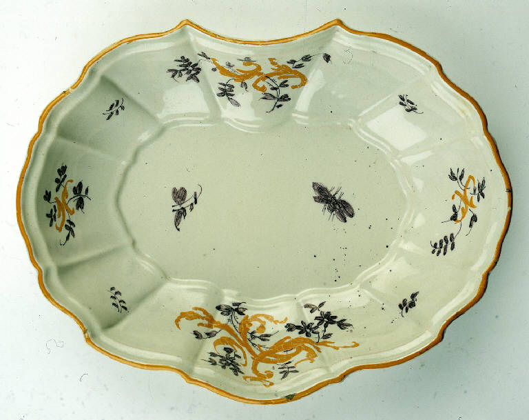 Catino da barba in maiolica dalla forma a ventaglio e con profilo mistilineo. La decorazione a gran fuoco è bicroma: l'orlo e quattro gruppi di rocaille di diverse dimensioni sono in giallo senape; gli steli fioriti che si intrecciano con i gruppi di rocaille e i due insetti volanti sono in viola di manganese .