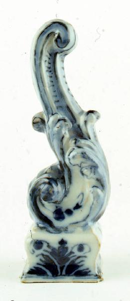 Due elementi ornamentali per la tavola formati da due virgole a rocaille montate su un parallelepipedo a base quadra. I due elementi sono decorati con pennellate che accompagnano e sottolineano l'andamento plastico, e con motivi fogliati stilizzati. La decorazione è in monocromia di cobalto.