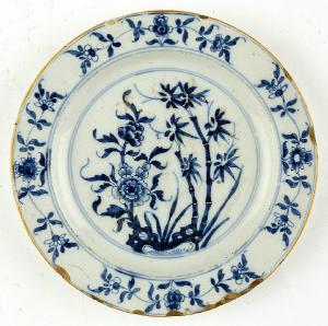 Piatti tondi dall'orlo liscio, tesa leggermente inclinata e anello d'appoggio ricavato dal fondo ribassato. Lungo la tesa è ripetuto per quattro volte un motivo floreale stilizzato e speculare. L'orlo è profilato in bruno chiaro ed è accompagnato da un filetto azzurro. Altre coppie di filetti blu sottolineano invece i margini della balza che rimane libera da decori accentuando quello ospitato nel fondo dove è presente una decorazione floreale orientale con canne di bambù sulla destra e grosse peonie sul lato sinistro. Sul retro sono presenti alcuni rami fogliati all'orientale. Lo smalto ha una leggera colorazione azzurrata.