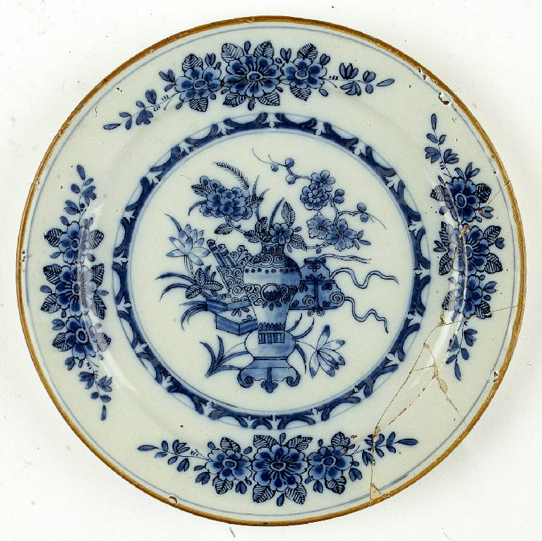 - NOTIZIE STORICO CRITICHE I piatti appartengono al legato di Francesco Ponti del 1895. La tipologia decorativa è fortemente ispirata alla ceramica orientale, dove elementi sacri erano uniti a fiori dal valore simbolico beneaugurante. I piatti appartengono alla produzione della manifattura milanese di Felice Casati come attestato dalla marca "Milano" presente in tre diverse formule sul retro di ogni piatto: "Mil.°" inv. 1725; "Mil.n°(apicale)" inv. 1726; "Milano" sull'inv. 979. I tre piatti furono realizzati tra il 1745 e il 1770.