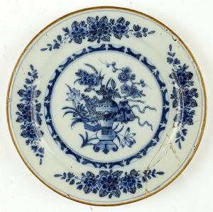 Tre piatti tondi dall'orlo liscio, tesa leggermente inclinata e anello d'appoggio ricavato dal fondo ribassato. La decorazione è presente tra la tesa e la balza, dove sono disposti quattro gruppi floreali formati da tre fiori di pesco stilizzati accompagnati da foglie secondarie. Nel fondo, incorniciato da una fascia blu "a giorno" che inquadra la composizione, vi sono elementi floreali, quali peonie, fiori di loto e di pesco, unitamente a oggetti di varia natura: un alto vaso a balaustro su un piedistallo, libri, rotoli, nastri.