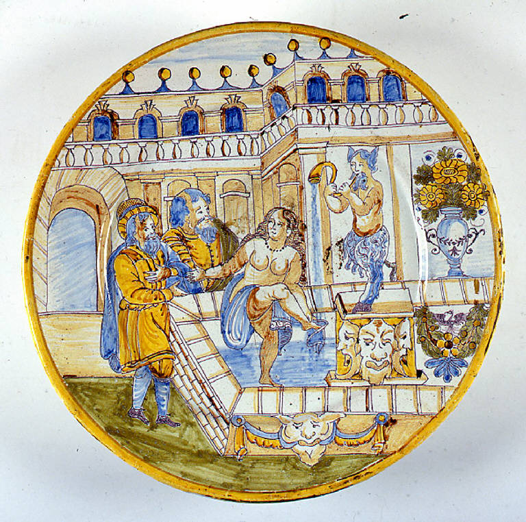 Grande piatto in smalto leggermente azzurrato, con tesa suborizzontale e base apoda convessa. La decorazione, che interessa tutto il piatto, riprende l'episodio biblico di Susanna al bagno e i due vecchioni, tema di larga diffusione nel XVII secolo. La scena si svolge all'interno di un cortile prospicente un palazzo con balaustre a colonnine, ed è occupata: al centro, dalla figura nuda della donna nella vasca, intenta ad asciugarsi un piede; sulla destra, da una fontana con una statua di fauno suonante un corno; sulla sinistra da due anziani in piedi. Il basamento della fontana e il muretto frontale della vasca sono decorati con mascheroni, mentre, l'interno della vasca è occupato da una decorazione floreale sormontata da un'aquila araldica, ancora, sopra il muretto posteriore, è poggiato un vaso di fiori. La scena è incorniciata, lungo il bordo, da una fascetta gialla. L'esterno è privo di decorazioni e di marca.