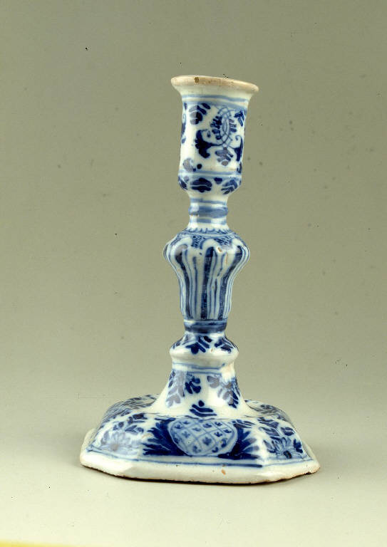 Portacandela a stilo in smalto bianco, su base ottagonale, modanata e leggermente bombata, nodo a balaustro e contenitore a parete liscia con labbro estroflesso. La decorazione è in monocromia di cobalto con un ornato "a lambrequins" che presenta sulla base un motivo di ovali a graticcio puntinato insieme a ciuffi di vegetali stilizzati, alternato a piccoli fiori sporgenti dal bordo; lungo il calice superiore, un motivo vegetale finemente eseguito. Il nodo a balaustro è decorato con baccellature in trompe-l'oïl.