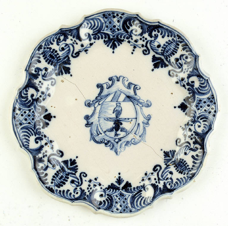 Piatto tondo con bordo lobato, tesa baccellata, privo di anello di appoggio. La decorazione presenta, nella tesa, un motivo articolato con "C" intrecciate, alternato a riserve a campana con graticcio puntinato; lungo gli interstizi dell'ornato si notano crocette puntinate e gruppi amorfi di puntini; al centro, un'insegna araldica tripartita in cornice accartocciata che riporta, nella fascia superiore, l'aquila asburgica, in quella centrale una mano a palmo aperto e in quella inferiore delle bande. Sul retro si legge la sigla "AMC".
