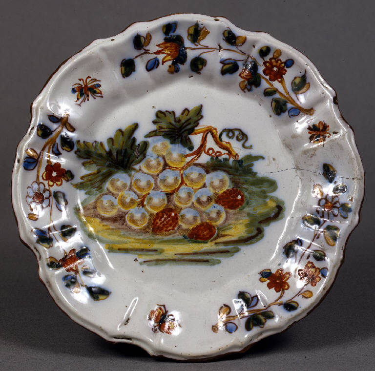 Piatto tondo, dalla tesa baccellata con forma "a coste", privo di anello d'appoggio. L'ornato presenta: lungo l'orlo una profilatura in bruno; sulla tesa, dipinti con grande scioltezza corsiva, un'alternanza di mosconi e tre tralci fioriti; sul fondo dei gruppi di frutti su piano erboso. Il piatto, porta sul retro della tesa, in verde a gran fuoco, la marca "AMC". Questi, sicuramente più antico, mostra una maggiore scioltezza nella stesura degli elementi: la sua natura morta con un grappolo d'uva protagonista è impostata con il bruno di manganese acquarellato, arricchito da tocchi di blu, giallo e verde marcio; sfumature di rosso ferroso sono utilizzate per colorare qualche acino e per rilevare alcuni fiori dei tralci secondari. Il tutto è protetto da pennellate di vetrina.