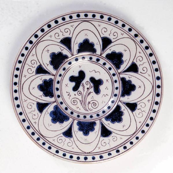 Piatto tondo a orlo liscio, basso cavetto, ampia tesa orizzontale a bordo arrotondato e piede appena incavato. \nL'ornato consiste in un medaglione centrale che racchiude uno stelo che regge una coppia di foglie di quercia trilobate e stilizzate. Attorno, fino all'orlo, contrassegnato da una stretta fascia di bacche, la decorazione si dispone simmetricamente all'interno di partizioni a petali disposti a mo' di corolla che racchiudono foglie polilobate. \nIl piatto è completamente rivestito da uno smalto di colore blu "zaffera", applicato in rilievo su sfondo bianco maiolicato.