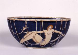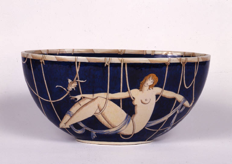 Ciotola ovale in maiolica. \nLa decorazione riporta una figura femminile nuda e distesa su un intreccio di corde che si agganciano al bordo e si raccordano nel lato posteriore, un leggero drappo ne avvolge il corpo attorcigliandosi su una gamba e sul braccio sinistro. Nella mano destra stringe un fiore dal lungo stelo. La figura, dipinta in giallo ocra e ombreggiata al tratto, è campita su un fondo blu lapis intenso che riveste anche il suo interno. Sotto la base si trovano le parole in bruno "Ginori/1031", delimitate, verso l'alto, dall'emblema di una corona stilizzata e, verso il basso, dalla firma "Gio Ponti".