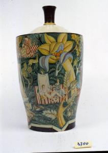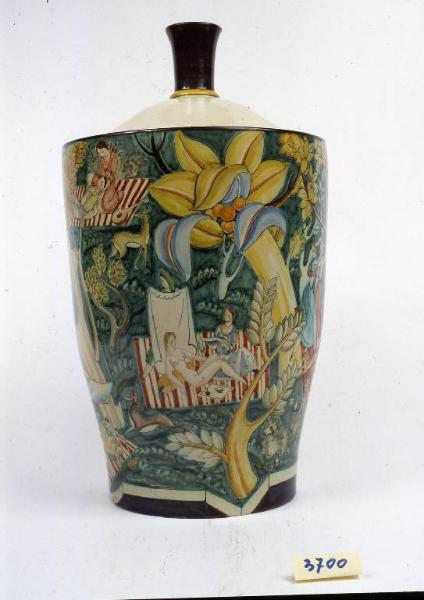 Vaso troncoconico, decorato in verde, giallo, blu, rosso, bianco e bruno con gruppi di figure, maschili e femminili, intente alle più diverse attività dalla musica, alla lettura, fino alla danza e al riposo. Il fondo boscoso riporta grandi alberi, fiori e cervi. Il coperchio è dipinto in bianco mentre la presa cilindrica in nero. Sotto la base sono riportate, in manganese, la marca con il gallo stilizzato e la scritta in tondo "FIRENZE".