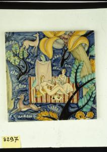 Piastrella quadrata in maiolica decorata in blu, verde, giallo, bruno e bianco. \nLa decorazione riporta, in primo piano, una donna nuda, su drappo a strisce, intorno, due serventi; sullo sfondo, un paesaggio alberato con piante esotiche e figure di cervi. Sul retro è stampato impresso "CANTAGALLI FIRENZE".