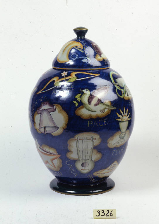 Vaso in maiolica con corpo ovoidale poggiante su piede espanso. Il coperchio, a doppia calotta, ha la presa a pomello carenato. La decorazione, su fondo blu di cobalto, riporta figure stilizzate nei toni dell'ocra, del grigio e del verde. Sotto ogni immagine si trova una scritta graffita in blu, riferita a ogni simbolo. Le scritte sono: sul corpo, eloquenza, amore, pace, lirica, lavoro, medicina, plastica, fede, fascismo, provvidenza, speranza, agricoltura, milizia, concordia, architettura, pittura, martirio, scultura; sul coperchio, segreto, gloria, navigazione, operosità. Sotto il piede sono dipinti in blu il simbolo del giglio e la scritta "R.I/D'Arte/FANTONI MARCELLO 1930 II CORSO/INFERIORE".