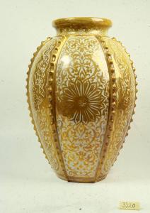 Grande vaso, foggiato e rifinito a tornio con applicazione "a crudo" dei cordoli, base a disco, corpo ovoidale con sei cordonature a rilievo, modellate a cresta e disposte verticalmente, basso collo cilindrico con orlo della bocca espanso. Smalto leggermente avoriaceo. \nLa superficie, interamente decorata da un fitto motivo ad arabesco vegetale in lustro dorato, presenta, nella parte mediana, un rosone. Sul collo sono dipinti triangoli ripassati. Sotto al piede si trovano la scritta "DERUTA", le iniziali "A M" e la data "1923".