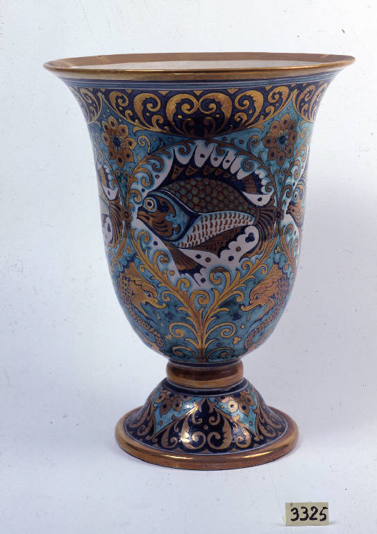 Vaso a campana, foggiato e rifinito a tornio, su alto piede svasato con nodo al breve collo, ampia bocca e orlo estroflesso. \nL'ornato in nero, acquamarina e lustro dorato, è costituito da quattro grandi pesci in cartelle di rami intrecciati; negli intervalli, da quattro delfini nella parte inferiore, e, in quella superiore, da quattro fiori affiancati da rabeschi. La bocca è anticipata da filettature concentriche. Sul piede, in fascia filettata, mezze corolle si alternano a motivi ad arabesco. Sotto al piede si trovano la firma, tracciata a lustro, "Magnini A" e la scritta, in blu, "DERUTA/ITALY/G7".