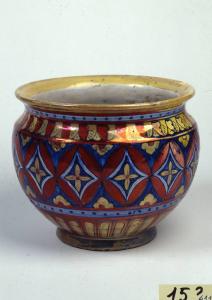 Vaso in maiolica lustrata, foggiato e rifinito al tornio, con ampio corpo globulare, spalla leggermente rastremata evidenziata da un cordolo, breve collo, ampia bocca, orlo arrotondato e estroflesso, e piede d'appoggio ad anello. Modellato con un impasto rosato è rivestito di smalto bianco e dipinto in blu con lustro giallo oro e rosso rubino. La decorazione presenta, nella parte centrale del corpo, un motivo a ovale con dentro un doppio rombo e un fiore quadripetalo; sulla spalla, da squame bipartite e da strette fasce filettate, sulla parte inferiore baccellature verticali ripassate. Sotto al piede si trovano l'acronimo "SCU" in triangolo, la sigla "PR" e l'iscrizione "ITALY".