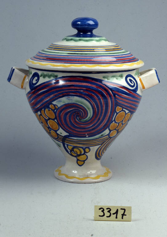 Zuppiera con corpo troncoconico e piede svasato, munita di due anse e di coperchio a calotta con pomello a bottone. \nLa decorazione, delineata con colori molto vivaci e brillanti, mostra, sulla superficie, grappoli d'uva stilizzati tra ampie fasce con riccioli. Le estremità sono tracciate da cornici a onda e a fili concentrici. Sotto la base, si trovano le iniziali "V L R P", in verde.