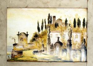 Grande piastra incastonata in cornice di legno. \nLa decorazione mostra, al centro, una collina, dipinta a tutto campo, con una chiesa circondata da alti cipressi; in primo piano, il cancello d'ingresso di una villa recintata da un muro coronato da sculture su alti pilastri; sulla destra, un carretto trainato da un mulo e una fontana monumentale che si affaccia su un belvedere. \nIn basso a destra è visibile la firma "Michele Cascella '36".