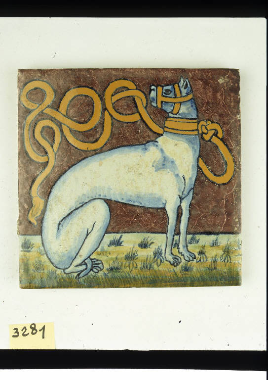 Grande mattonella quadrata, di notevole spessore, smaltata sul recto, con tracce di colore che continua lungo i margini bisellati. \nLa decorazione mostra un levriero bianco con museruola, seduto e rivolto verso sinistra; emblema di Gianfrancesco II Gonzaga.