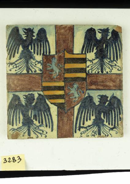 Grande mattonella quadrata, di notevole spessore, smaltata sul recto, con tracce di colore che continua lungo i margini bisellati. \nLa decorazione mostra lo stemma crociato con, ai lati, le aquile, e, al centro, lo scudo quadripartito, nel primo e nell'ultimo quarto si trovano delle righe orizzontali ripetute, nel secondo e nel terzo, un leone rampante.