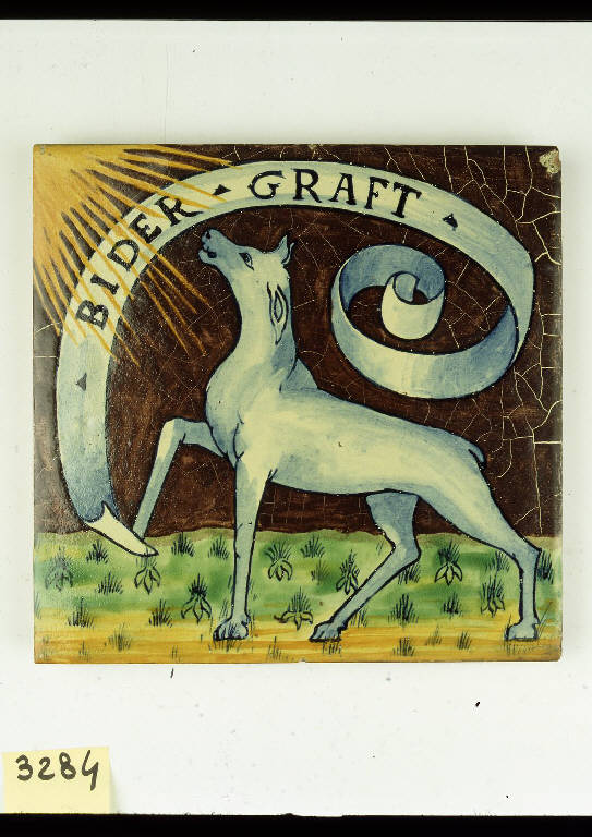 Grande mattonella quadrata, di notevole spessore, smaltata sul recto, con tracce di colore che continua lungo i margini bisellati. \nLa decorazione mostra una cerva bianca volta a sinistra, verso il sole raggiante e il nastro con la dicitura "BIDER GRAFT".