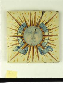 Grande mattonella quadrata, di notevole spessore, smaltata sul recto, con tracce di colore che continua lungo i margini bisellati. \nLa decorazione mostra il sole con i raggi intrecciati a nastri e alla scritta "PER UN DIXIR".