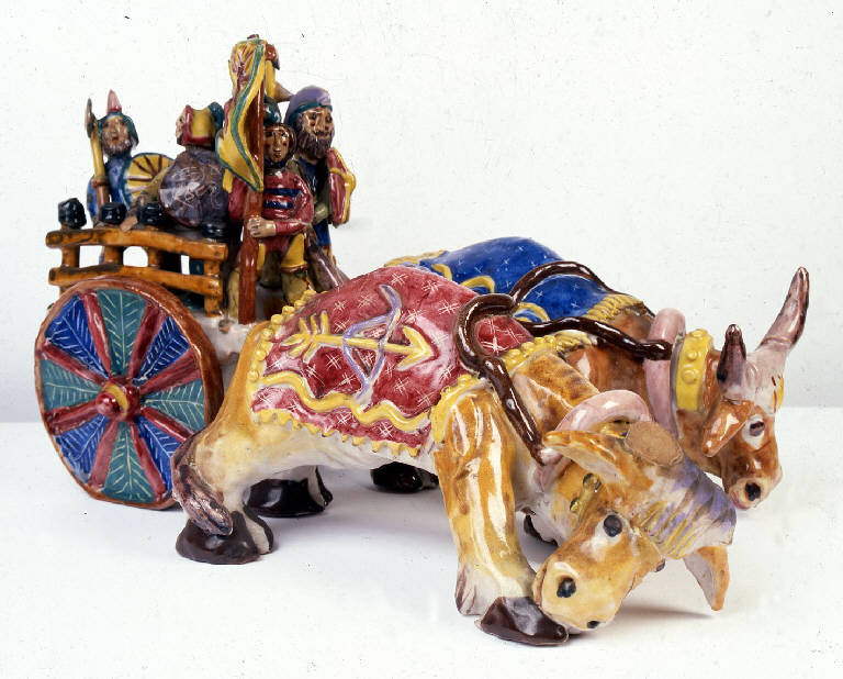 - NOTIZIE STORICO CRITICHE Il gruppo plastico è stato realizzato a Vietri sul mare, tra il 1927 e il 1929, presso l'Industria Ceramica Salernitana. \nL'Industria Ceramica Salernitana è stata fondata a Vietri da Max Melamerson nel 1927, a dirigerla fu chiamato Riccardo Dolker, l'artista considerato il fulcro della colonia tedesca nella cittadina salernitana. Quest'ultimo mantenne la direzione dei laboratori per circa un biennio, riversando nella produzione un impareggiabile contributo, tanto d'idee quanto di modelli. Nell'esemplare qui in esame si nota come, accanto a una rappresentazione all'apparenza allegra e vivace, non sia difficile cogliere una pungente ironia. I buoi, allegoria della cultura contadina delle genti meridionali, trainano, infatti, una sorta di "armata Brancaleone", la quale allude alle velleitarie ambizioni militari manifestate dagli apparati del potere in quegli anni.