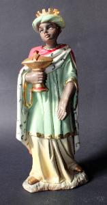 Re Magio moro in piedi in atteggiamento di adorazione. Nella mano sinistra reca un dono.