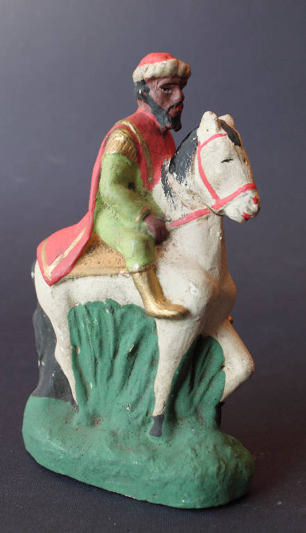Re Magio moro in sella ad un cavallo bianco. Nella mano sinistra reca un dono.