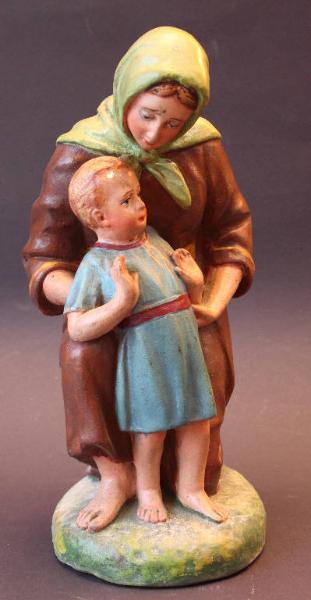 Donna inginocchiata che abbraccia un bambino dalla veste azzurra.