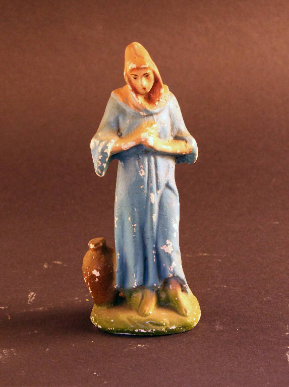 Donna con velo arancio sul capo e le mani giunte al petto. La figura indossa una lunga veste azzurra. Ai suoi piedi è collocato un vaso.