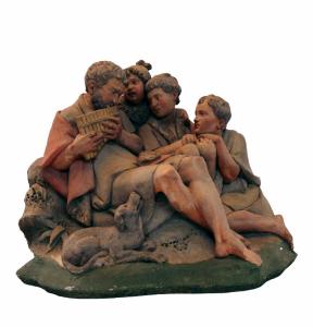 Gruppo scultoreo composto da un pastore musicante con cane attorniato da tre bambini.