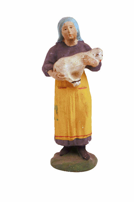 - NOTIZIE STORICO CRITICHE Statuetta da presepio raffigurante una donna recante tra le braccia un agnello. La figura è raffigurata con una veste bruna e un grembiule giallo.